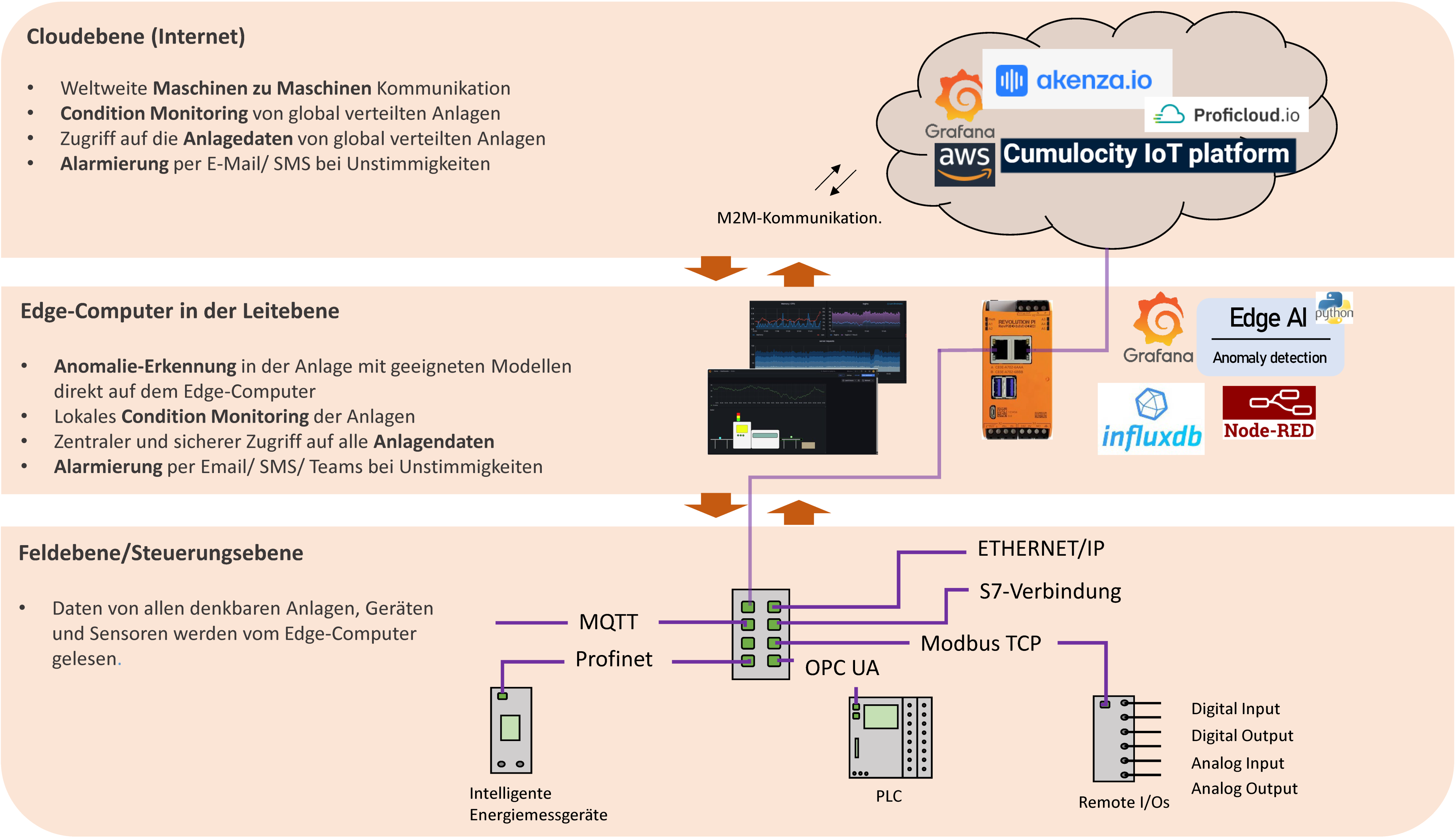 Müssen die Daten der Maschinen, Anlagen oder von Prozessen standordunabhängig über das Internet verfügbar sein oder ist eine weltweite Maschine zu Maschinen Kommunikation nötig, bietet es sich an vorgefilterte Daten an eine internetbasierte Cloudlösung (AWS, Proficloud, Cumulocity...) weiterzuleiten. Je nach Cloudlösung sind Datenaquise, Speicherung, Analyse und Nutzung in unterschiedlichen Ausprägungen verfügbar. Dabei verarbeitet der Edge-Computer die Daten vor und wirkt als Gateway zu einer Cloudlösung.