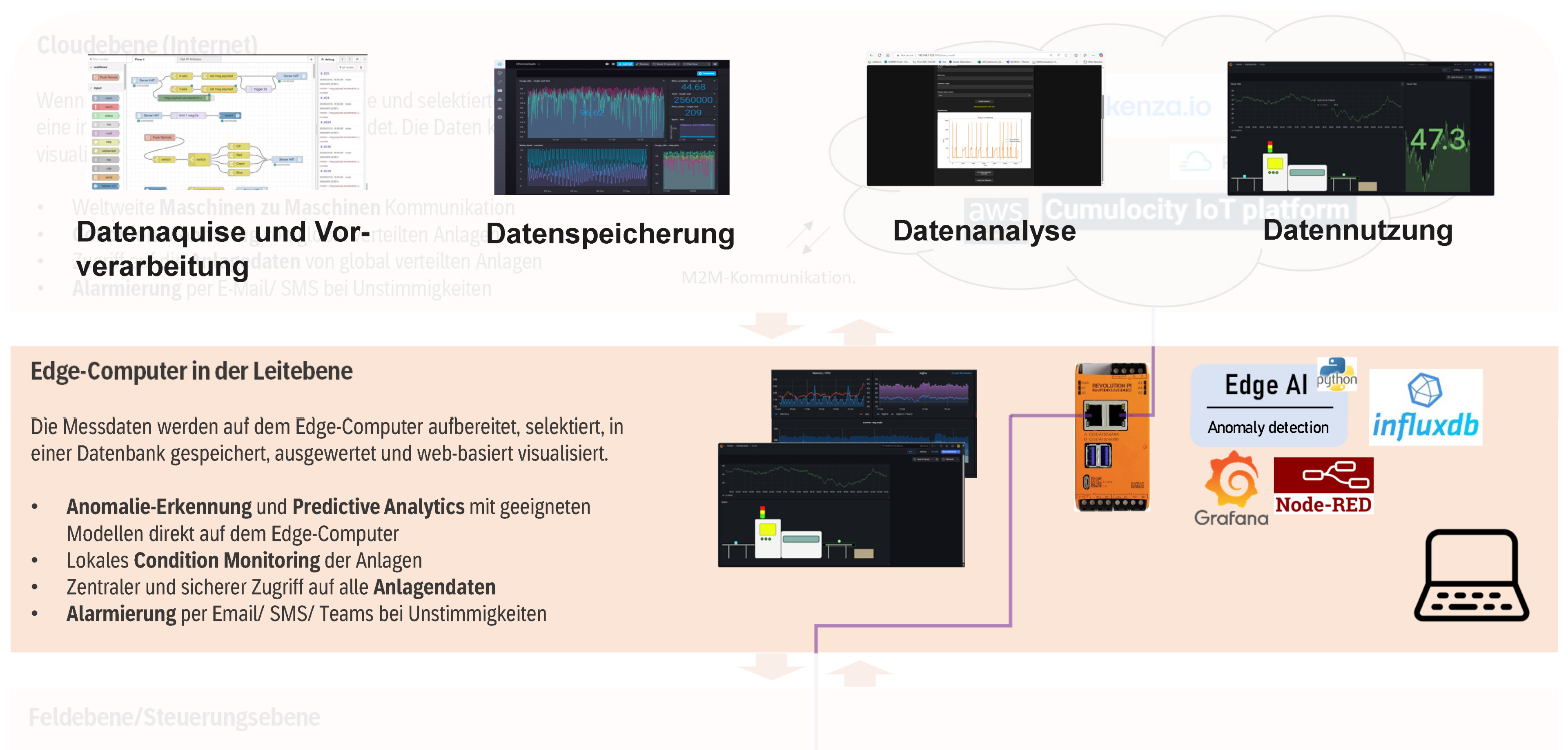 Die erfassten Daten können direkt auf dem Edge-Computer verarbeitet und analysiert werden. Für die Analyse stehen unterschiedliche Methoden zur Verfügung – von der rein visuellen Überwachung über automatische Verfahren mit einfachen Schwellwerten bis hin zu komplexen Anomalie-Erkennungen mit Hilfe von Machine-Learning-Modellen.