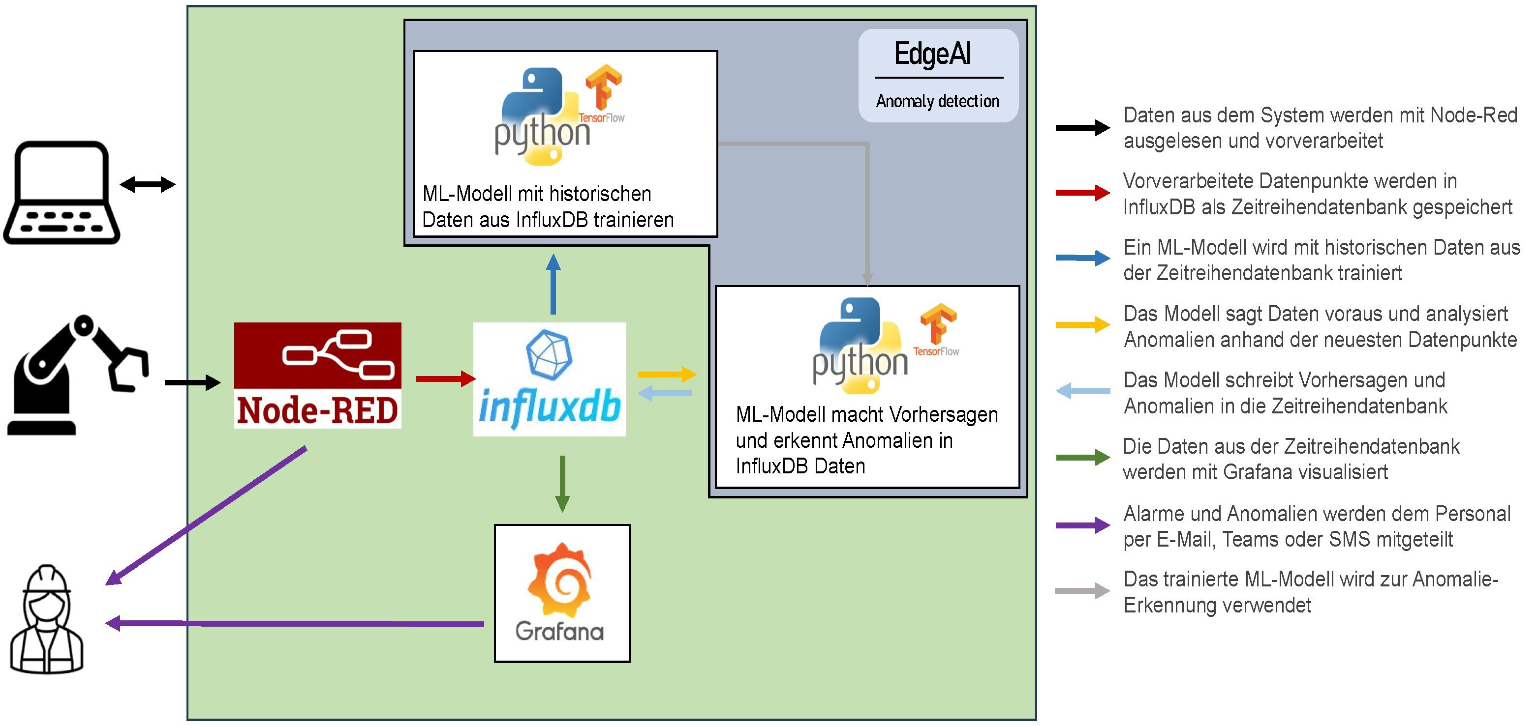 Die Daten werden mithilfe von Node-RED (einer visuellen Programmierumgebung) erfasst, vorverarbeitet und in InfluxDB gespeichert. Node-RED ermöglicht eine einfache und flexible Konfiguration der Datenströme sowie die Anbindung verschiedener Sensoren und Automatisierungsprotokolle an den Edge-Computer.